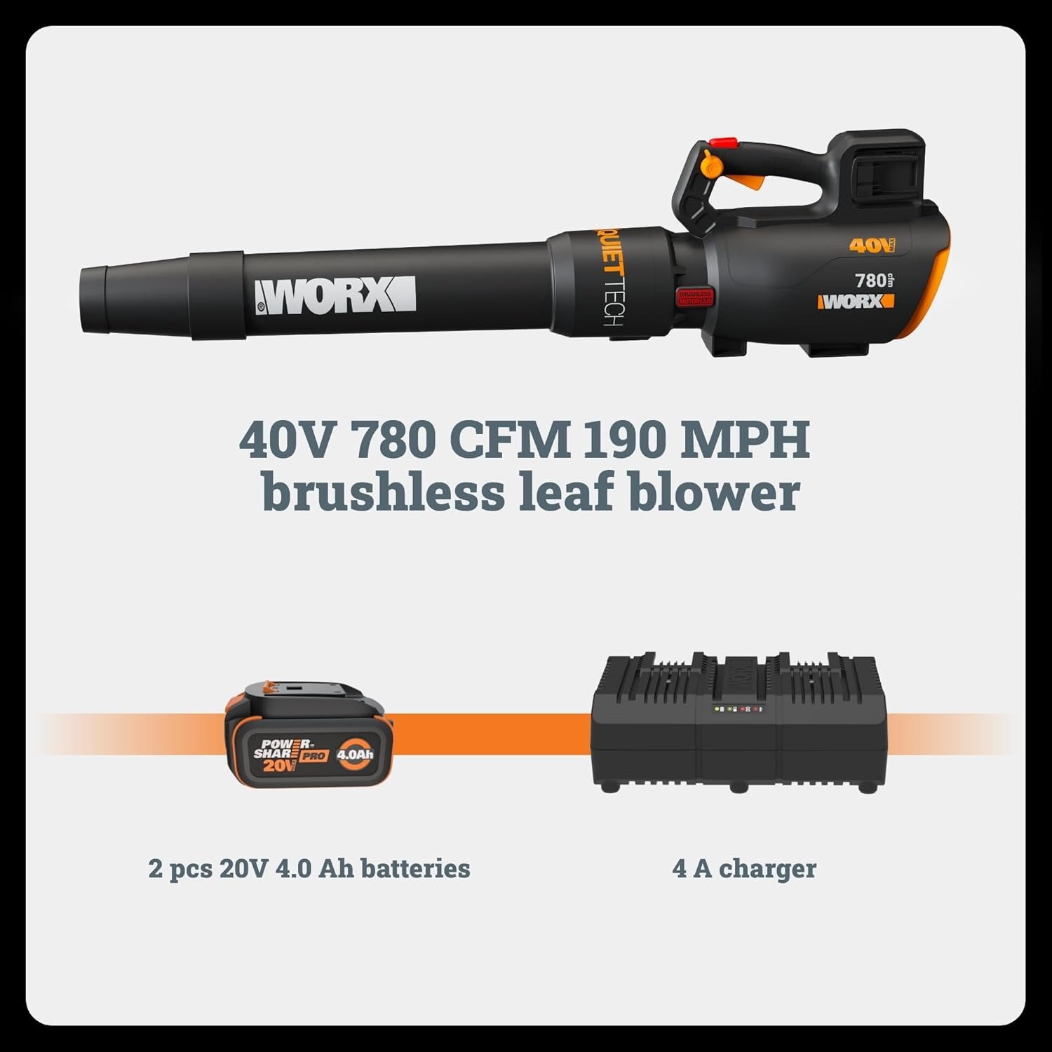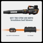 WORX Cordless Leaf Blower, Electric Blower with 780 CFM & 190 MPH, Brushless Lawn Blower with Gas-Like Power & 57 dB, 2 × 4.0 Ah Batteries & Charger Included, WG582