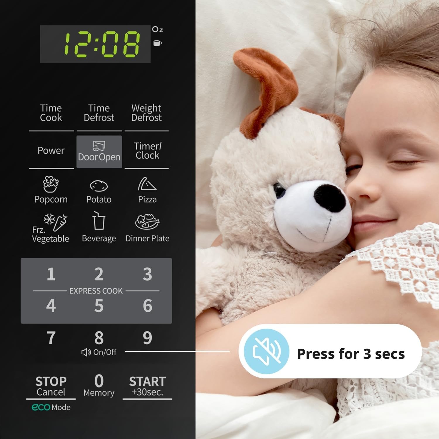 - Mute Function: Turn off all the microwave beeps by pressing the sound on/off button for 3 seconds, for a quiet cooking experience