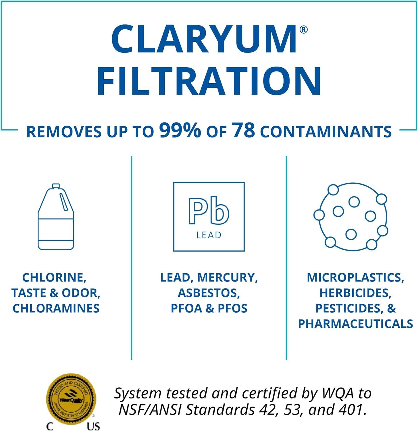 - Claryum Technology – Four methods of filtration reduce up to 99% of 78 contaminants including lead, PFAS (specifically PFOA and PFOS), chlorine, pesticides, microplastics, and more. Removes 15x more contaminants than leading pitcher filters while retaining beneficial minerals.