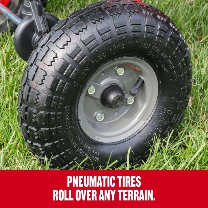• 10 in. X 4 in. Turf Tread tires for nonslip traction and Smooth rolling experience