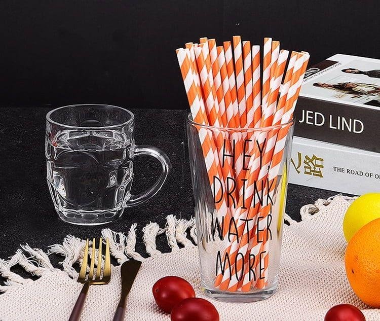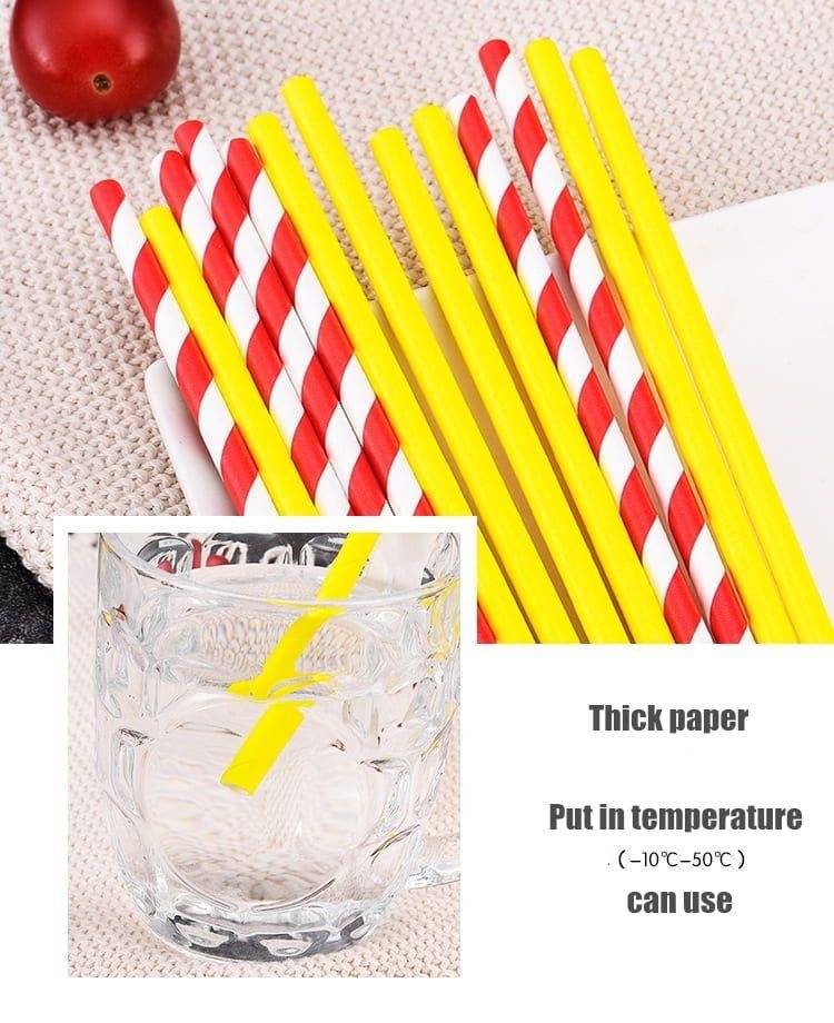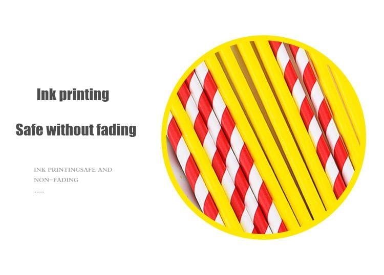 The straw is made of safe paper, and the product has passed FSC, FDA, LFGB and the European Union's standard tests. After use, it completely degrades and meets the hygienic requirements of European and American countries for food safety packaging. It can be used in various places such as home, holiday birthday parties, dessert arrangement, children's DY appliances, etc. Straw length: 195cm hole thickness 0.6cm. Soaking for too long will make it a little soft, but it will not affect the use. The straws are all printed with food grade ink.Random Color