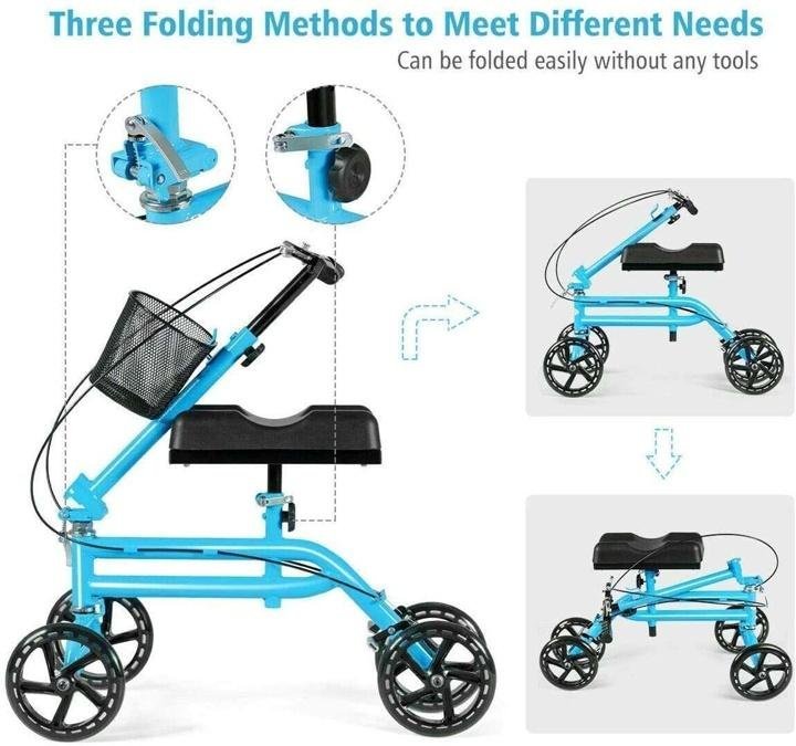 Double Steel Tube Walking Aids Scooter w/Shopping Basket, Dual Brake Medical Steerable Folding Knee Walker, Turning Brake Knee Bike, Great for Injury Sportman Leg Surgery, Blue