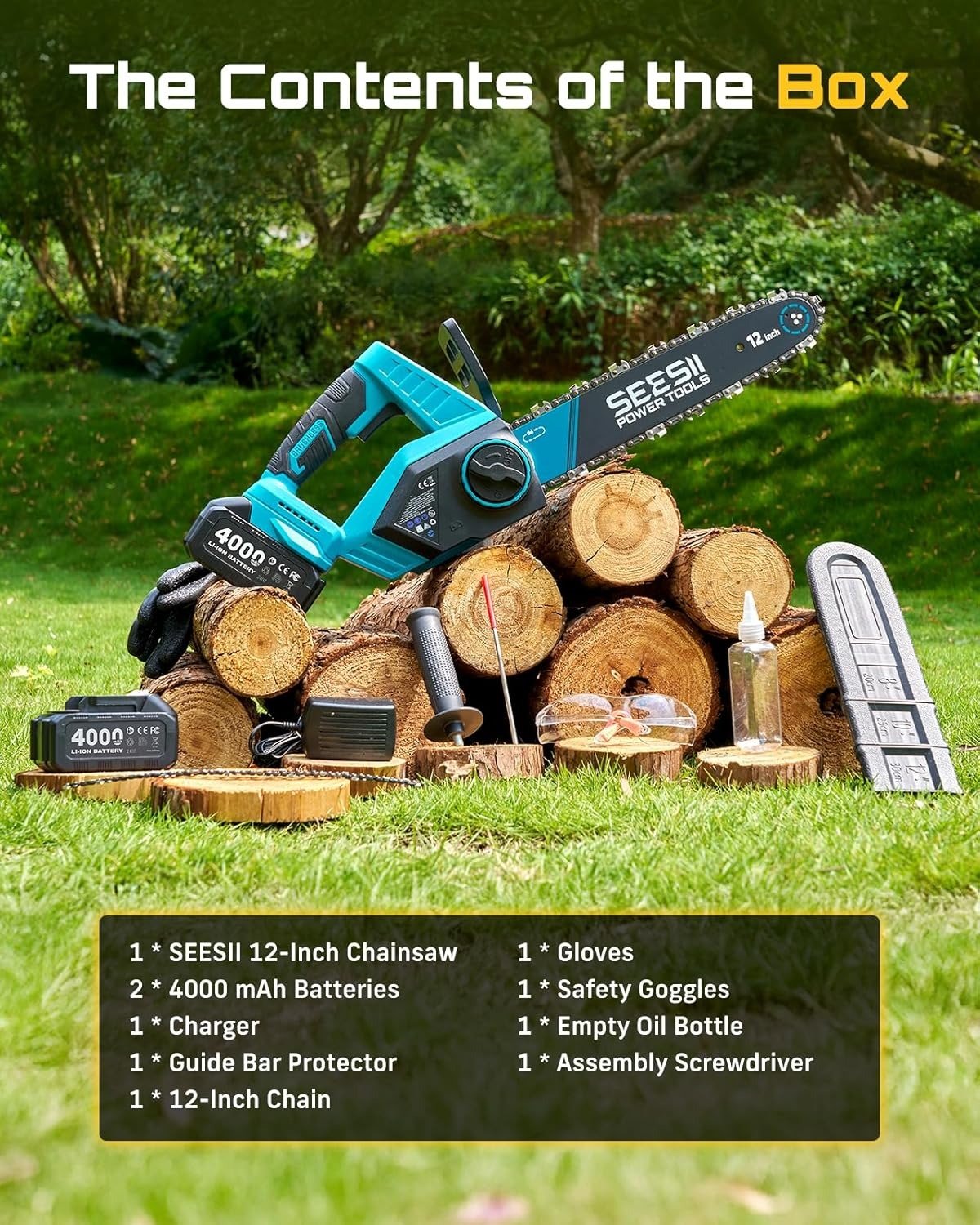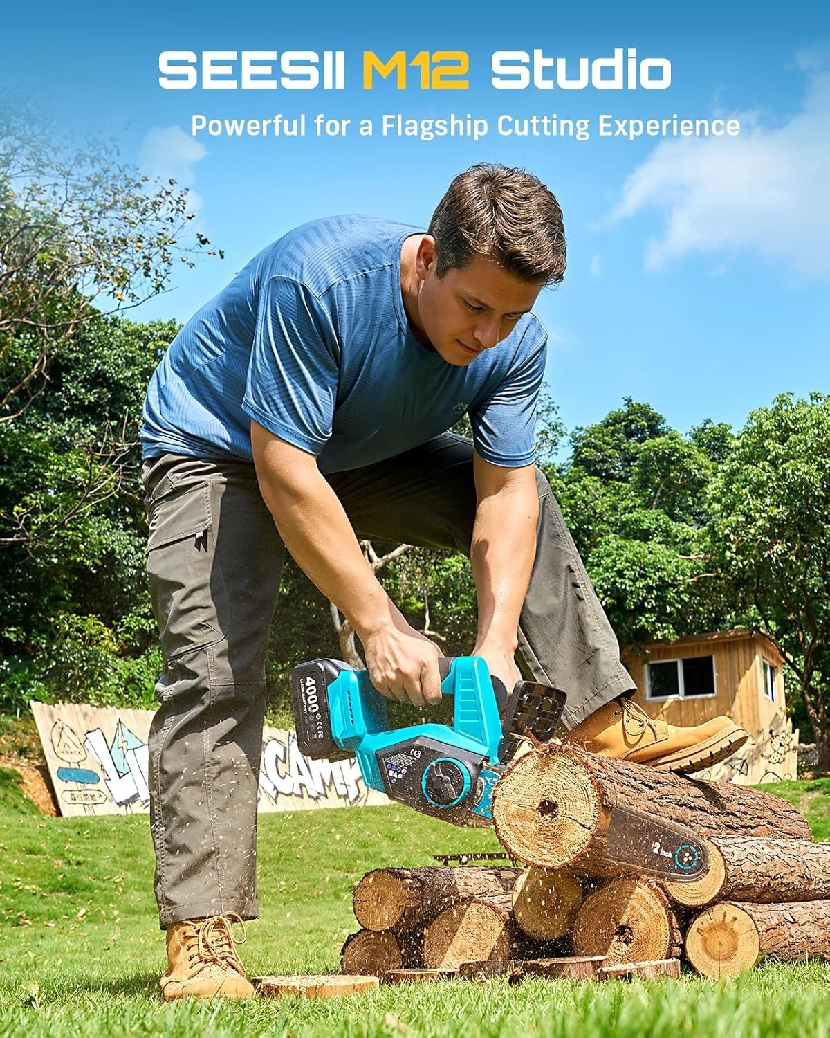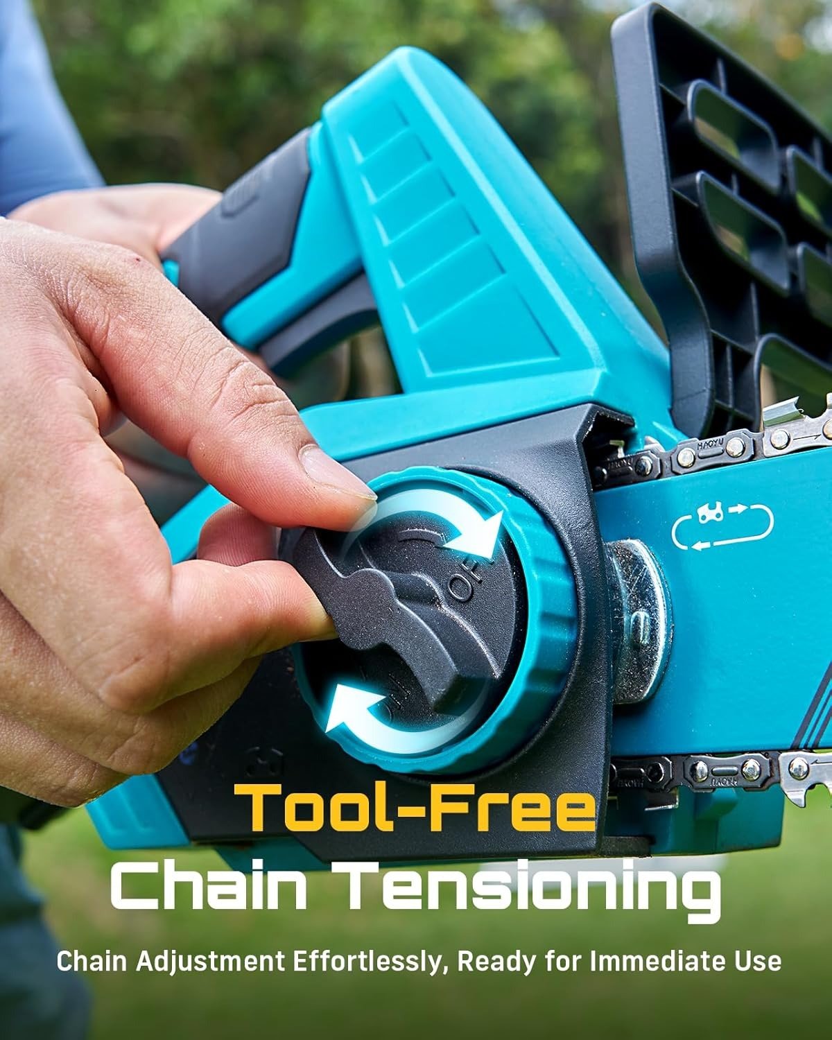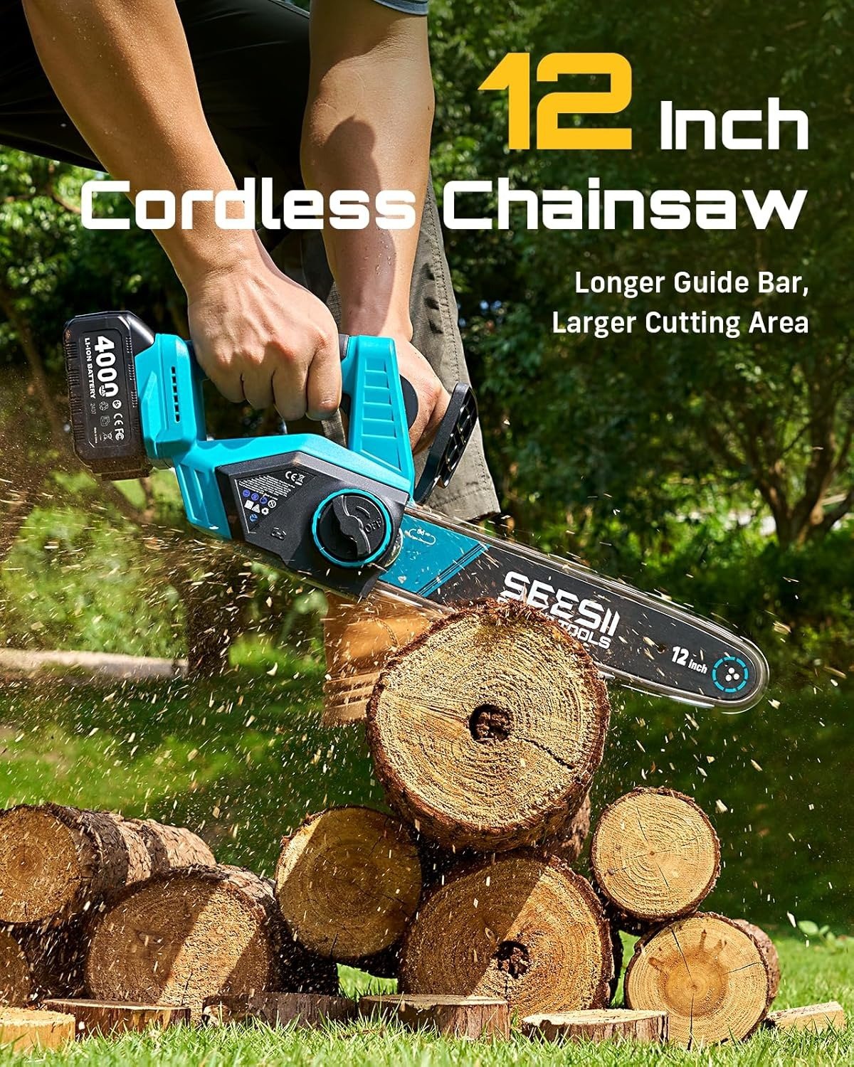 - Lightweight & Cordless – Total Freedom Weighing just 12 lbs , this compact, wireless chainsaw lets you work anywhere—no cords, no limits. Perfect for remote job sites, rooftops, or backyard projects.