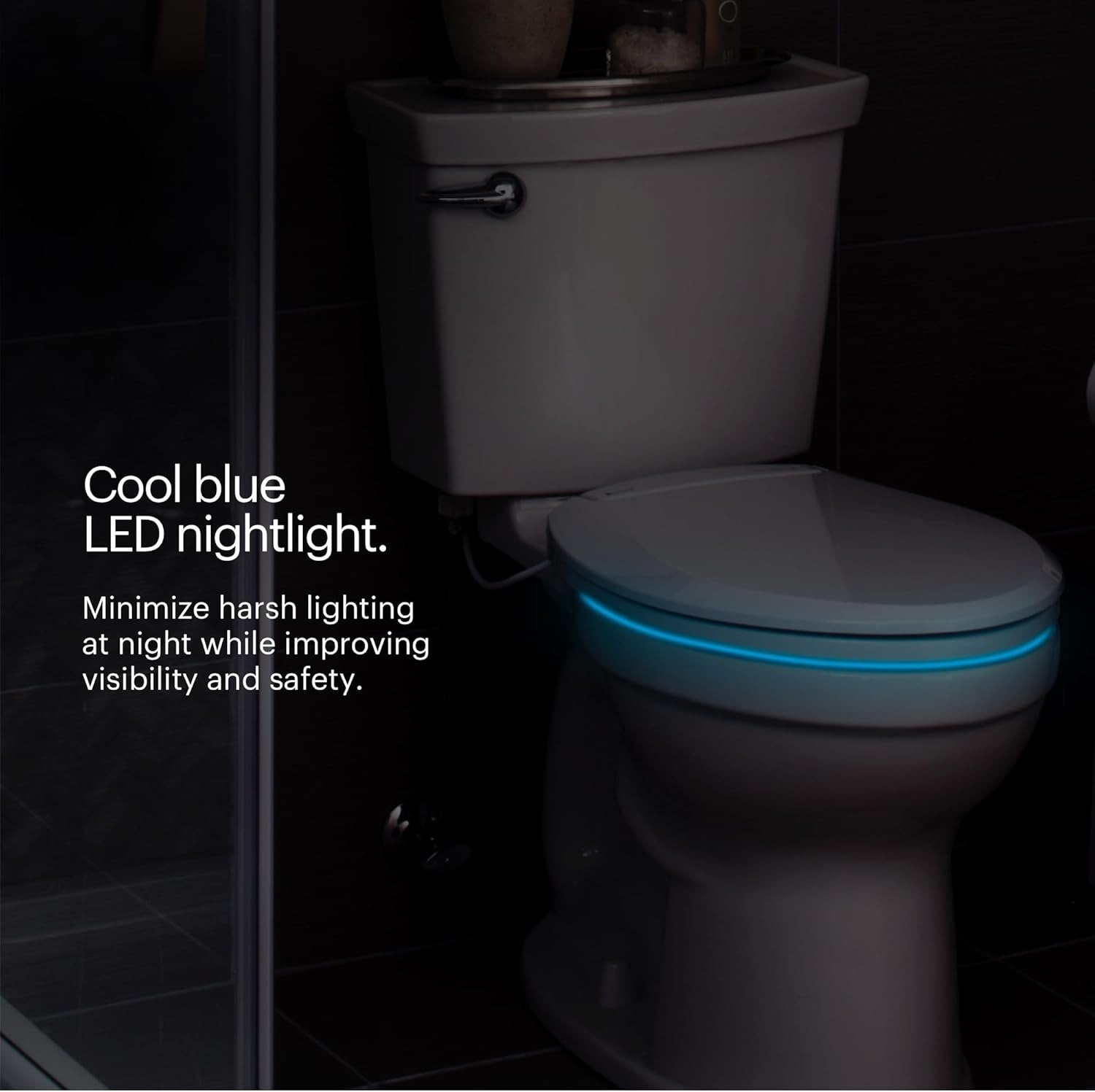 A built-in blue LED nightlight provides a soft, soothing glow that illuminates the toilet bowl, enhancing visibility during nighttime bathroom visits without disrupting sleep. The nightlight features a simple on/off button and uses long-lasting LED technology for reliability and energy savings.