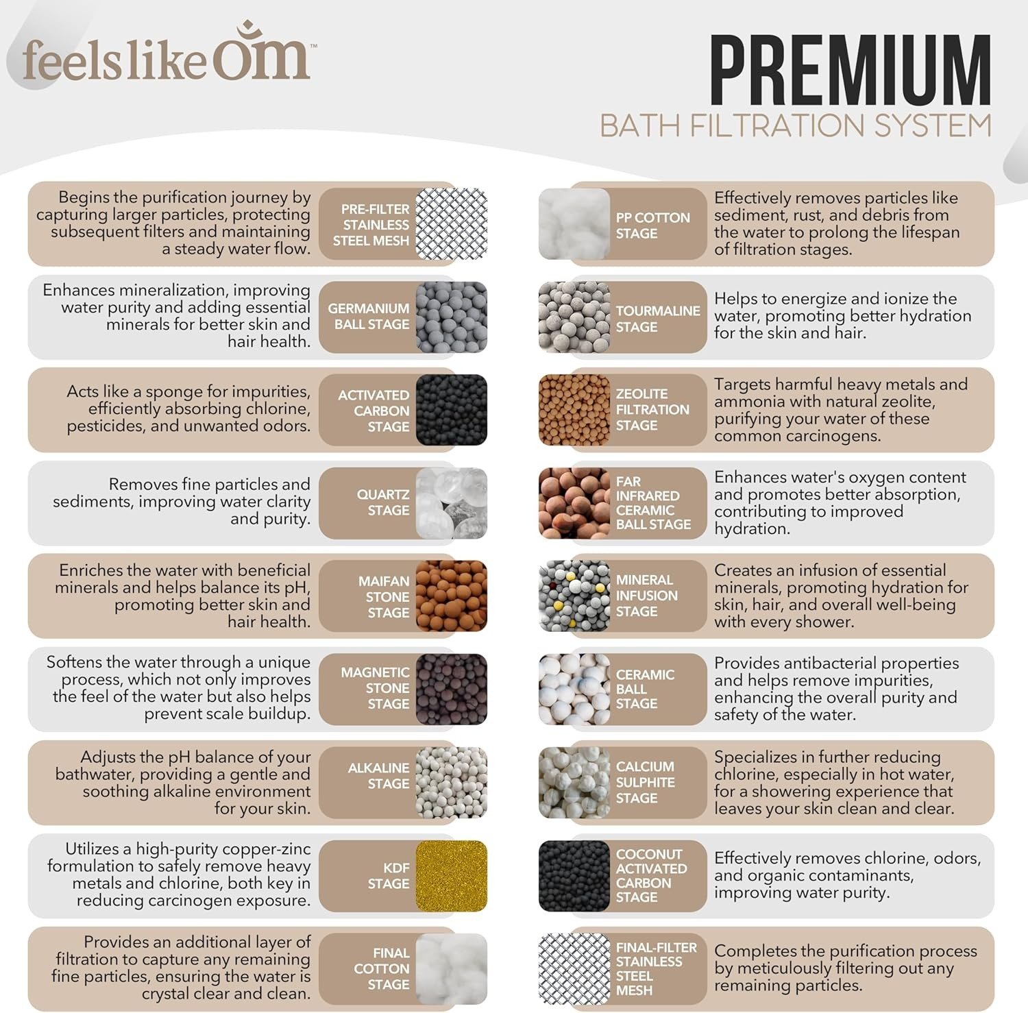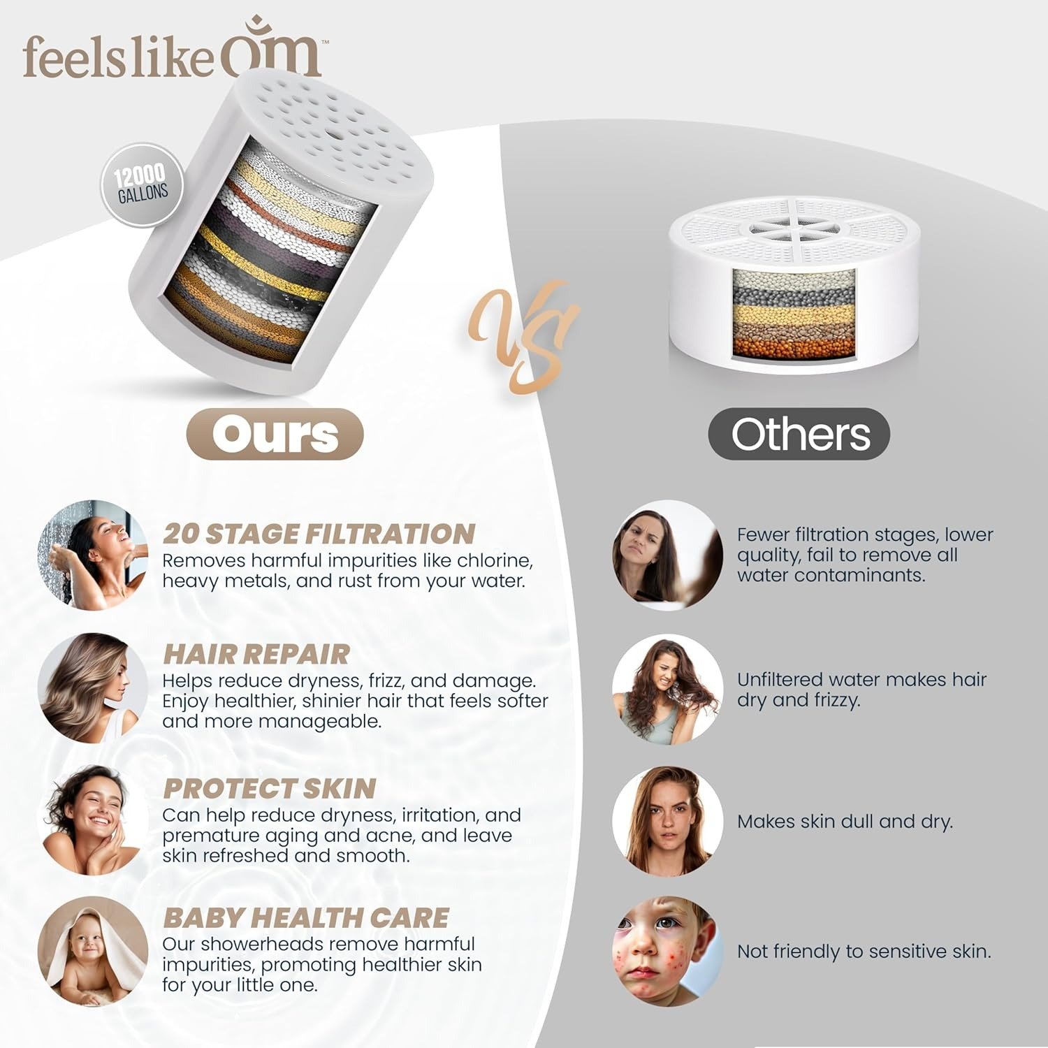 - SUPERIOR 20-STAGE FILTRATION: Feels Like Om’s advanced filtered shower head features an innovative 20-stage water softener shower head system that removes 99% of chlorine, toxic chemicals, and harmful contaminants. Our shower head filter for hard water is engineered with premium filtration technology to deliver the purest, cleanest shower experience possible. Transform your daily shower with professional-grade water filtration.