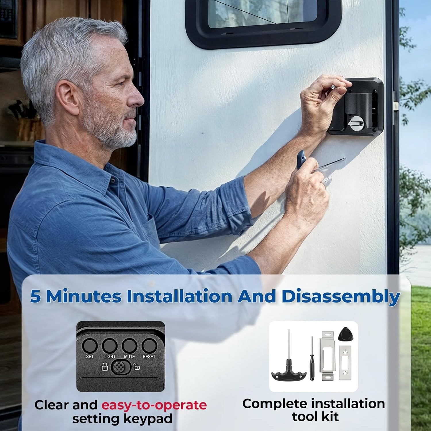 - All-in-One Installation Kit: Includes every screw, screwdriver, and tool you need to install your camper door lock—no extra trips to the hardware store. Even comes with tools for future battery changes and a clear user manual for hassle-free setup. Fits standard RV openings (3.75″ x 2.75″ x 1.5″) and has an exterior size of 6.3″ x 4.7″, perfect for most RV doors with right-side hinges