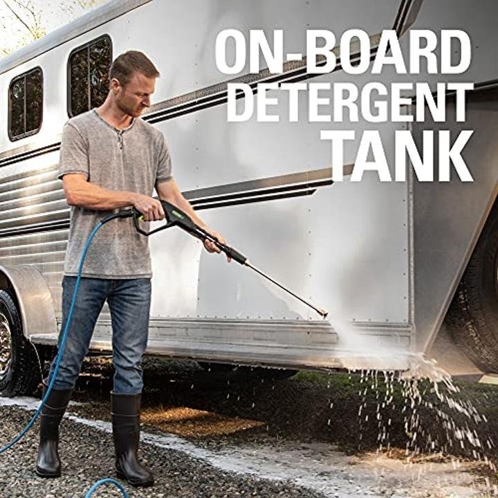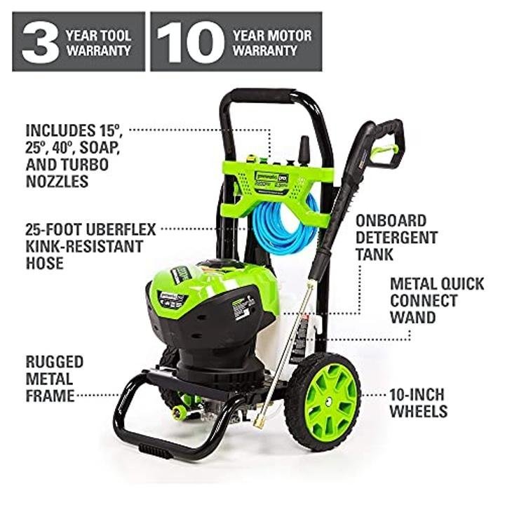 Details: The Greenworks 2200 PSI pressure washer features a powerful brushless motor, 2. 3 GPM, metal quick connect wand, (15~, 25~, 40~, soap, and turbo nozzles), Tangle-Free hose, Onboard detergent tank, 8′ wheels, 3-year
