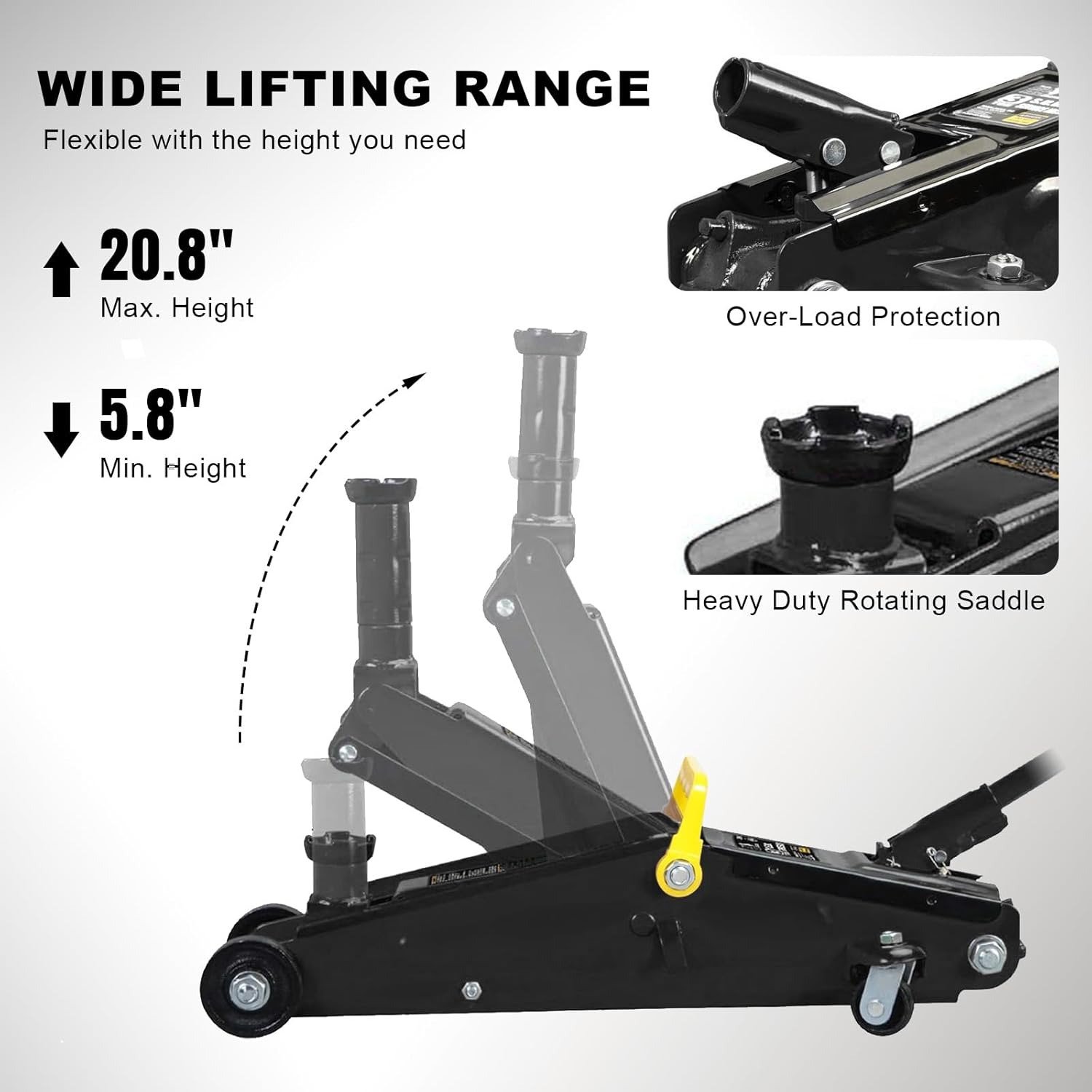 - Features a 3 ton (6,000 lb) capacity with a minimum lifting height of 5.8″ and a maximum height of 20.8″; Ideal for most cars, trucks, vans, and SUVs