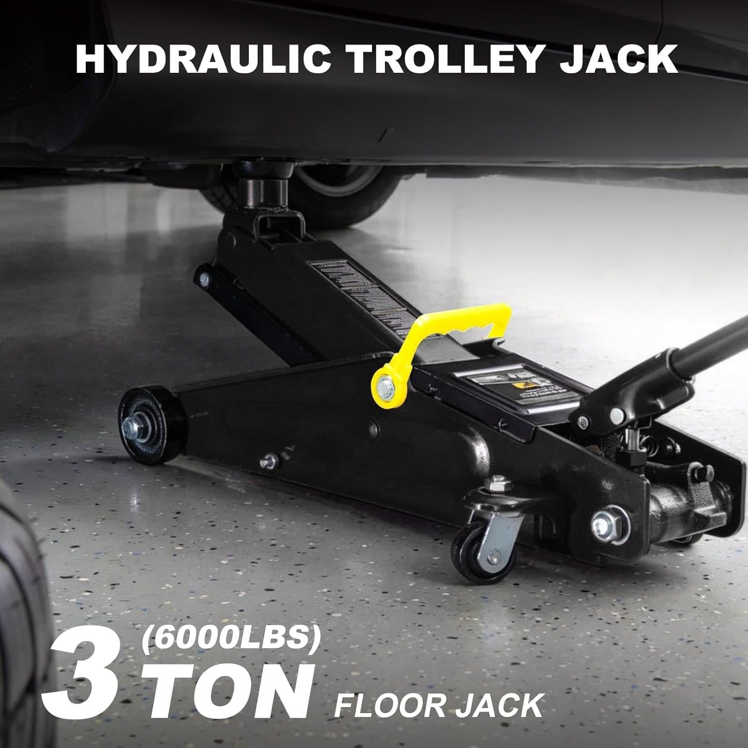 - Hydraulic trolley floor jack is constructed with heavy duty steel, providing long term durability with an industrial luster