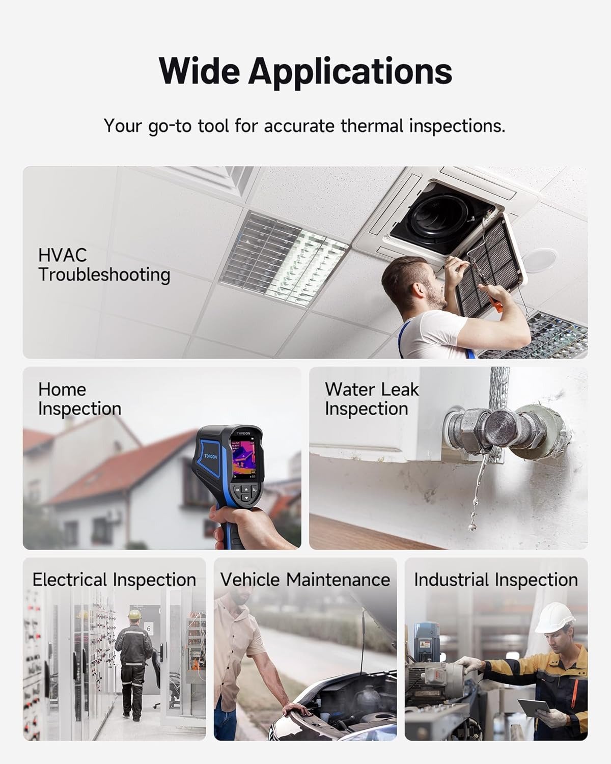 - 【Wide Application with Smart Alerts and Photograph】From underfloor heating to leak detection and electrical inspections, the TC004 Mini adapts to every challenge. When temperatures exceed preset levels, an on screen warning alerts you instantly while automatically capturing a photo to streamline your diagnostics. In addition, TC004 Mini also supports manual photo taking to help you record and solve problems, and the built-in 512MB eMMC storage can store up to 8,000 photos