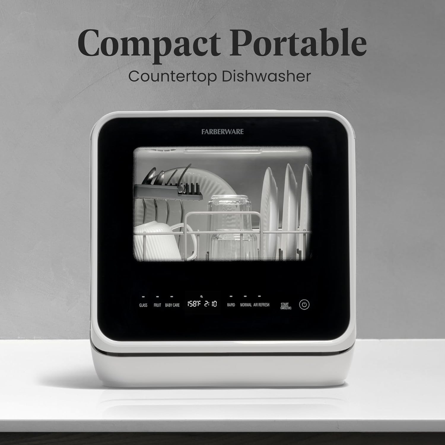- VERSATILE CLEANING: The Farberware countertop dishwasher offers five different wash cycles, including baby care, glass, and fruit wash, ensuring that all your dishes, from delicate glassware to baby bottles, are thoroughly cleaned and sanitized.