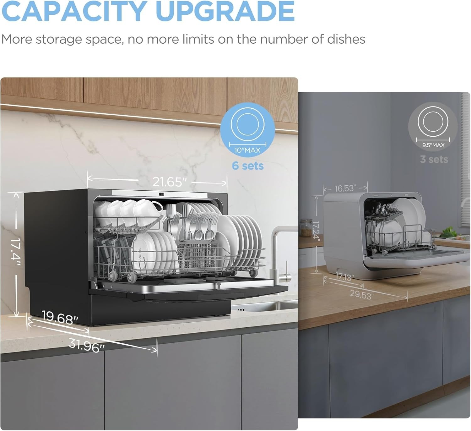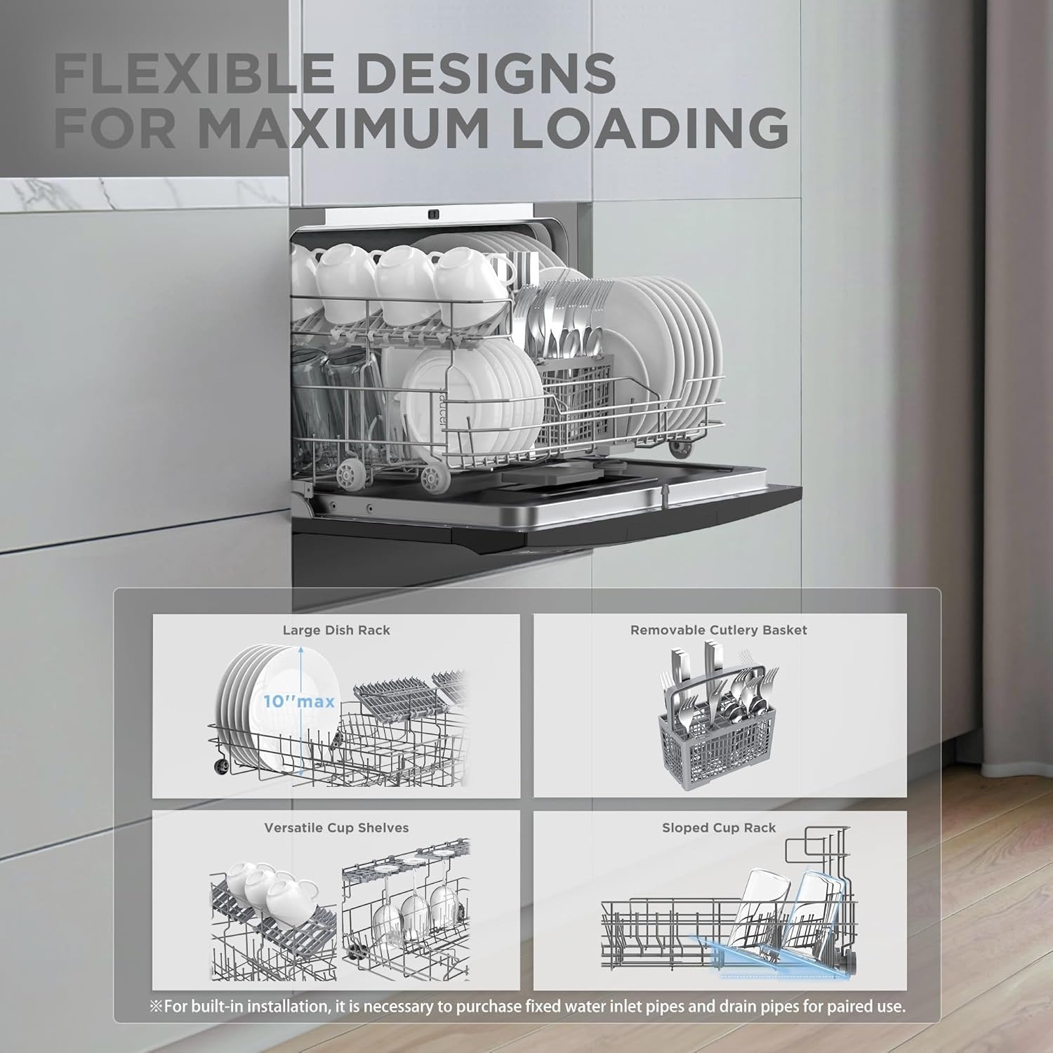 • 6 Place Setting- A perfect size (H17.2″×W21.6″×D19.7″) for 2-3 people, COMFEE’ compact dishwasher is suitable for dorms, RVs, and apartments. This countertop dishwasher can fit up to 70 pieces of tableware and has a plate size of up to 10 inches in diameter. Note: COMFEE dishwashers are tested at the factory before they are shipped. If your new dishwasher has some water inside, this is normal.