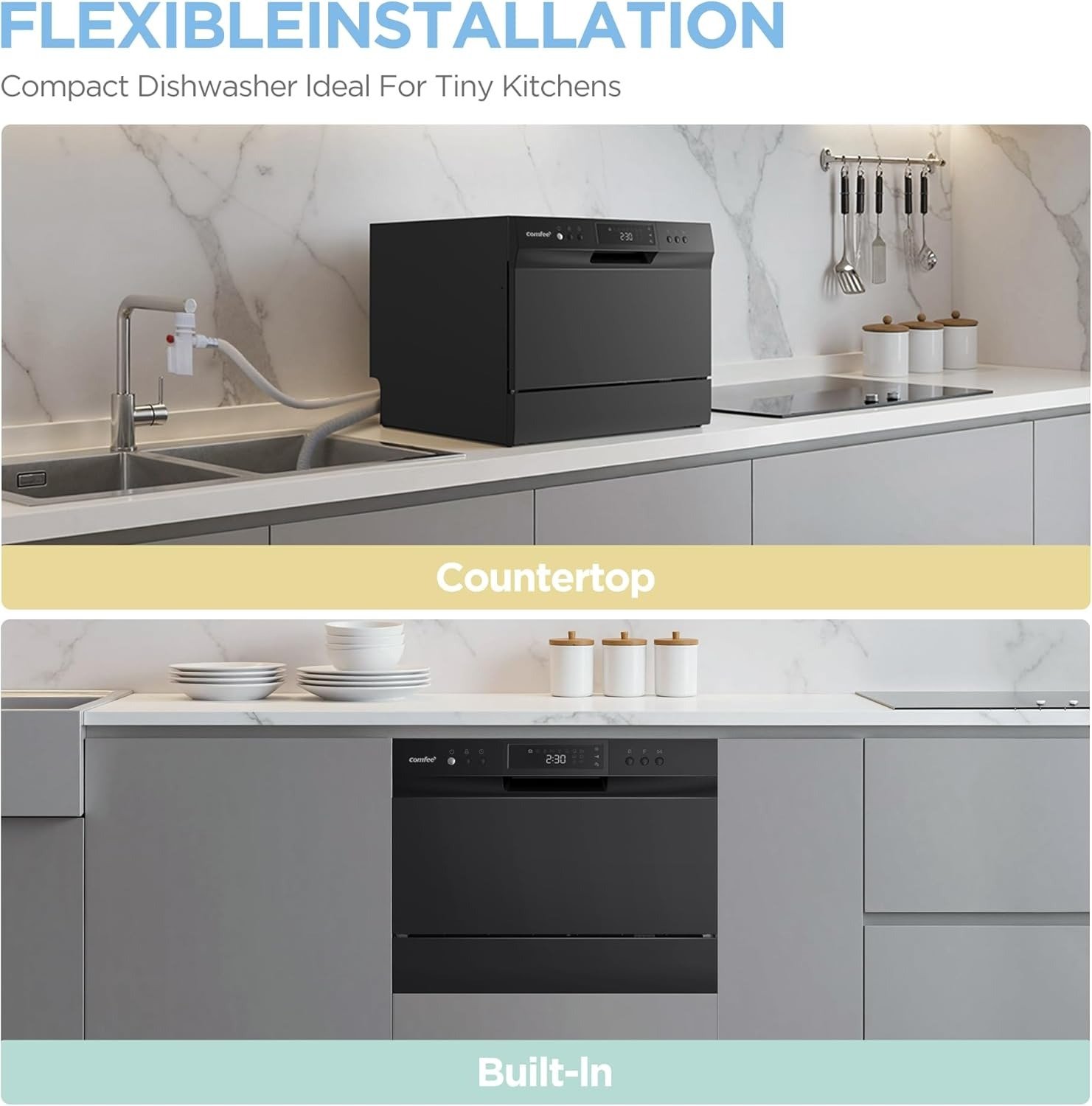 • Simple Installation- COMFEE’ portable dishwasher can be connected to faucet directly (Suitable adaptor needed). Depending on your needs, it can be flexibly placed on the table or fitted in the cupboard.