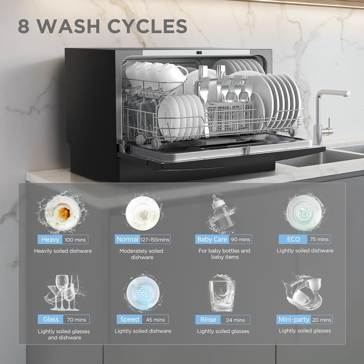 • 8 Washing Cycles- Most of the cleaning cycles, including Heavy, Normal, Baby-Care, ECO, Glass, and Speed, helped with extra-drying function, and deliver sparklingly cleaned and dried dishes. Three more cleaning options, including Speed, Mini-party, and Rinse, are designed for COMFEE’ compact dishwasher, providing high flexibility for you to choose in different situations.