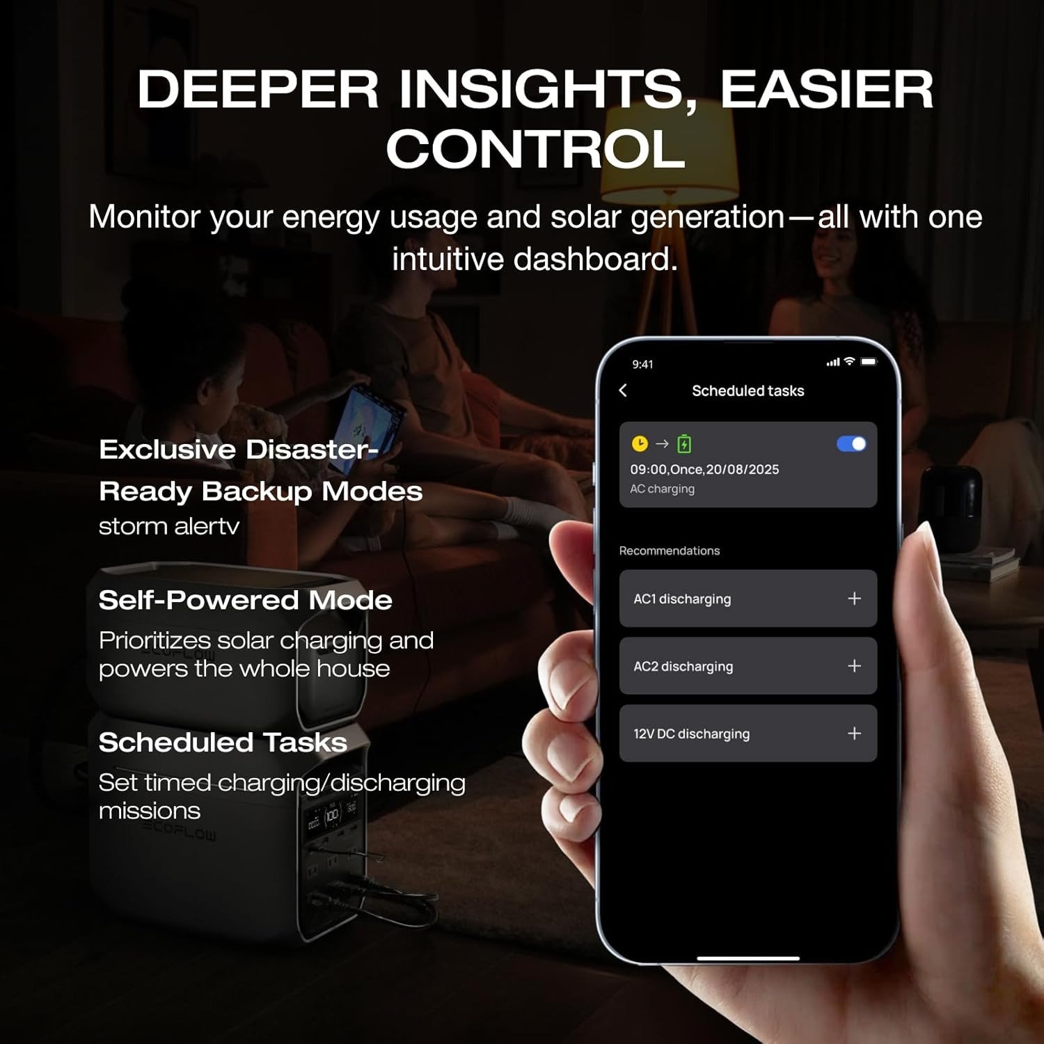 • Smart App Control: Take charge of your energy with the EcoFlow app. Monitor usage, set charging schedules, and activate backup modes like Storm Alert or Self-Powered Mode—all from your phone.