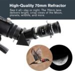 - BRIGHT, SHARP VIEWS ANYWHERE: Unlike many beginner telescopes, this quality refractor features fully coated glass lenses and a 70mm aperture for crisp, clear views of the Moon, planets, and daytime scenery—all in a lightweight, travel-ready design.