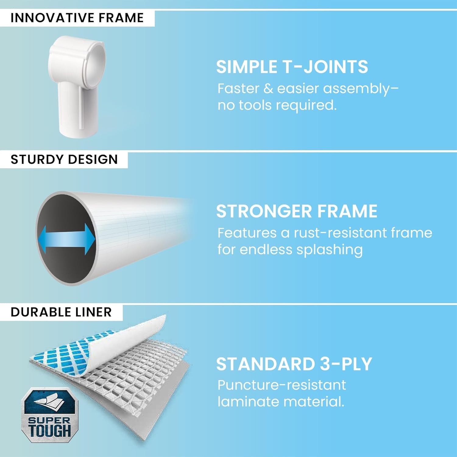 • ✔ EASY TO ASSEMBLE – Ready for water in just 30 minutes; spread out on level ground preferably on top of a ground cloth (sold separately), setting the metal frame with our innovative composite T-Joint design makes assembly quick and easy with no tools required.