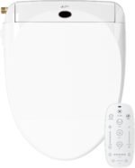 This modern electric bidet toilet seat is designed for round toilets, bringing luxury and hygiene to your bathroom with a range of adjustable features. Crafted from durable polypropylene (PP) material with a sleek white finish, it features an ergonomic contoured design that offers maximum comfort, even during extended use. The compact dimensions (19.29″L x 15.03″W) ensure a perfect fit for most standard round toilets.