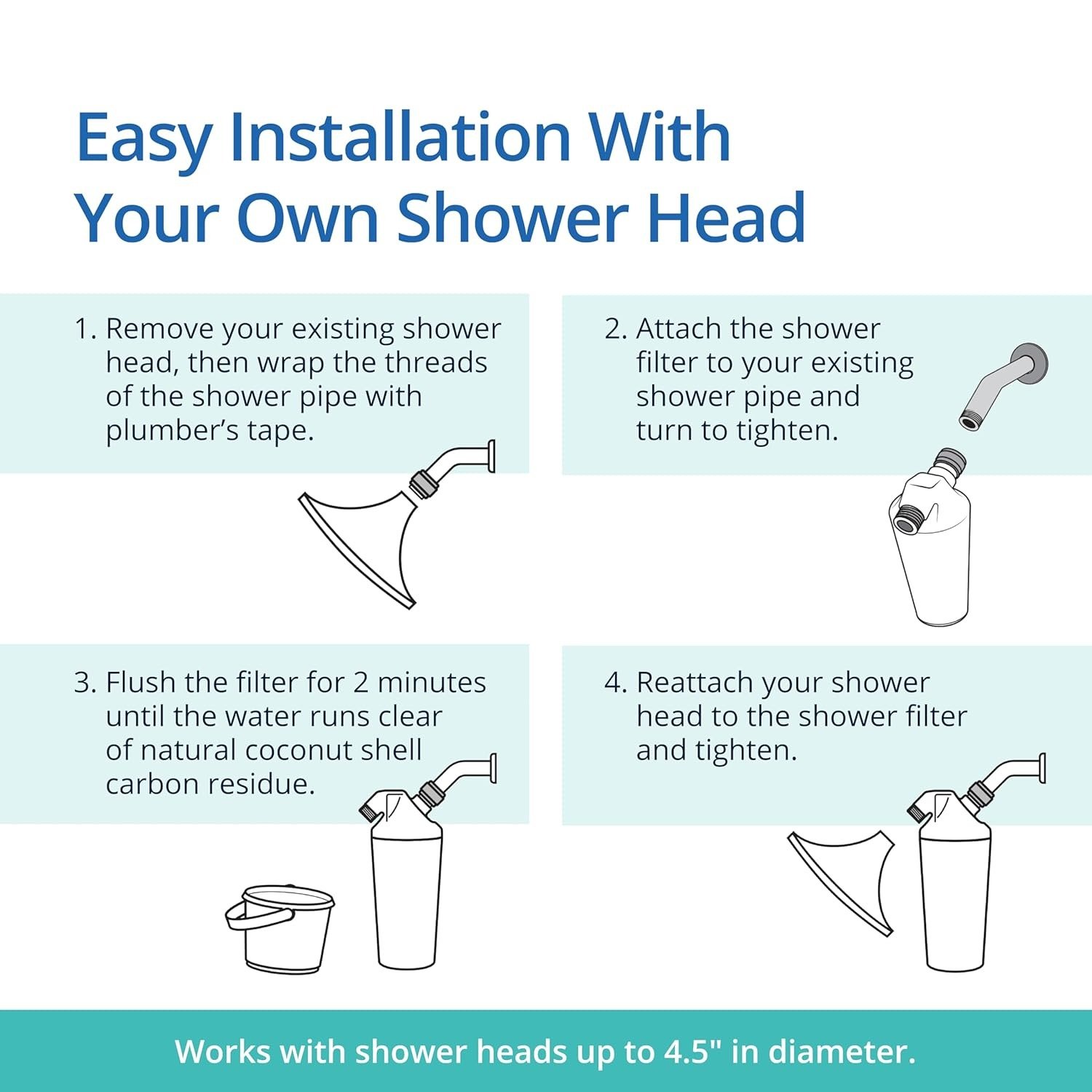 • – No plumbing skills needed Set up in minutes with 4 simple steps. Fits standard ½” shower arms. After installing, run water to clear carbon fines. Replace filters every 6 months for optimal filtration