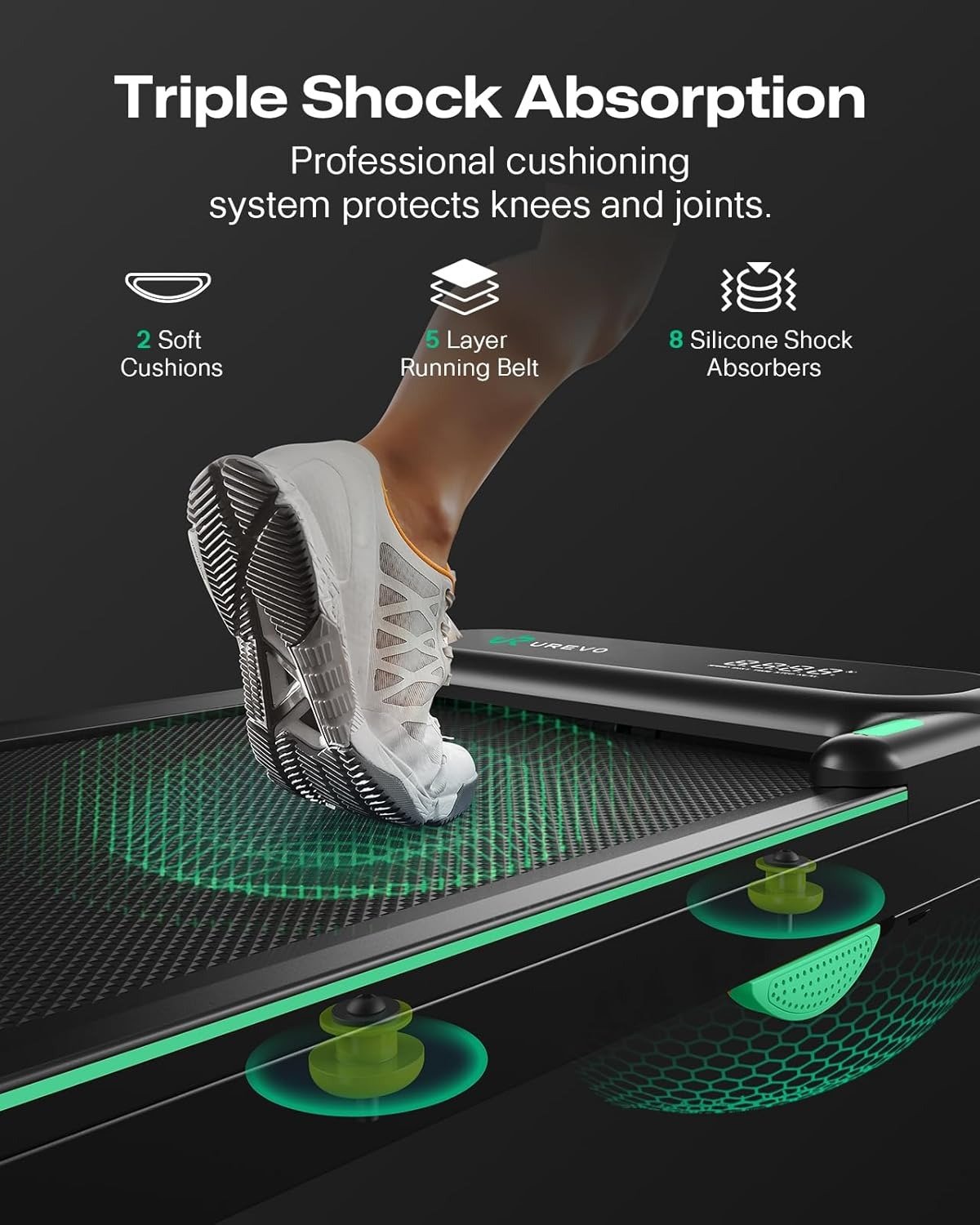 - 【Joint Protection】The walking treadmill features a spacious 15″ x 40.1″ track for free movement, equipped with a 5-layer anti-slip belt, 8 silicone shock absorbers, and 2 soft rubber pads. This setup not only ensures a comfortable workout experience but also effectively reduces joint impact, providing essential protection for your knees.