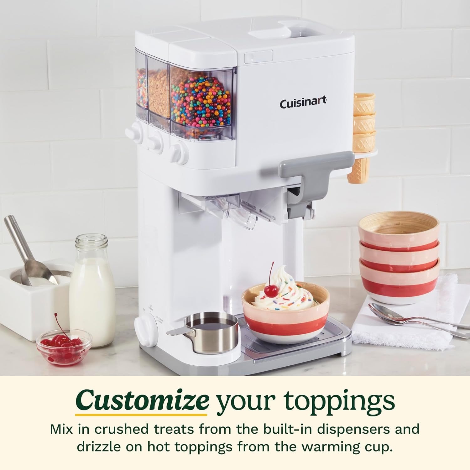 • MUST-HAVE FEATURES: ON/OFF Power Dial, Cone Holder – Conveniently holds a stack of extra ice cream cones. Can hold both flat and pointed-bottom cones – Removable Drip Tray – Can be removed for easy cleaning. Mix-in Gauge – Check the size of mix-ins by dropping them through. Mix-ins that do not fit through will clog the ice cream maker