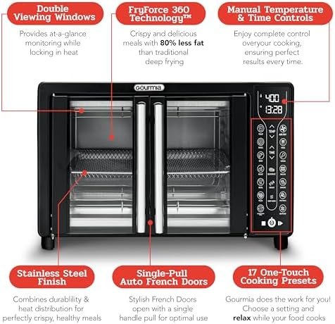 Spacious French Door Design – Dual doors open with one hand for easy loading of family-size meals, its 25 quart capacity fits a 12-inch pizza, 6 slices of toast, or a whole chicken