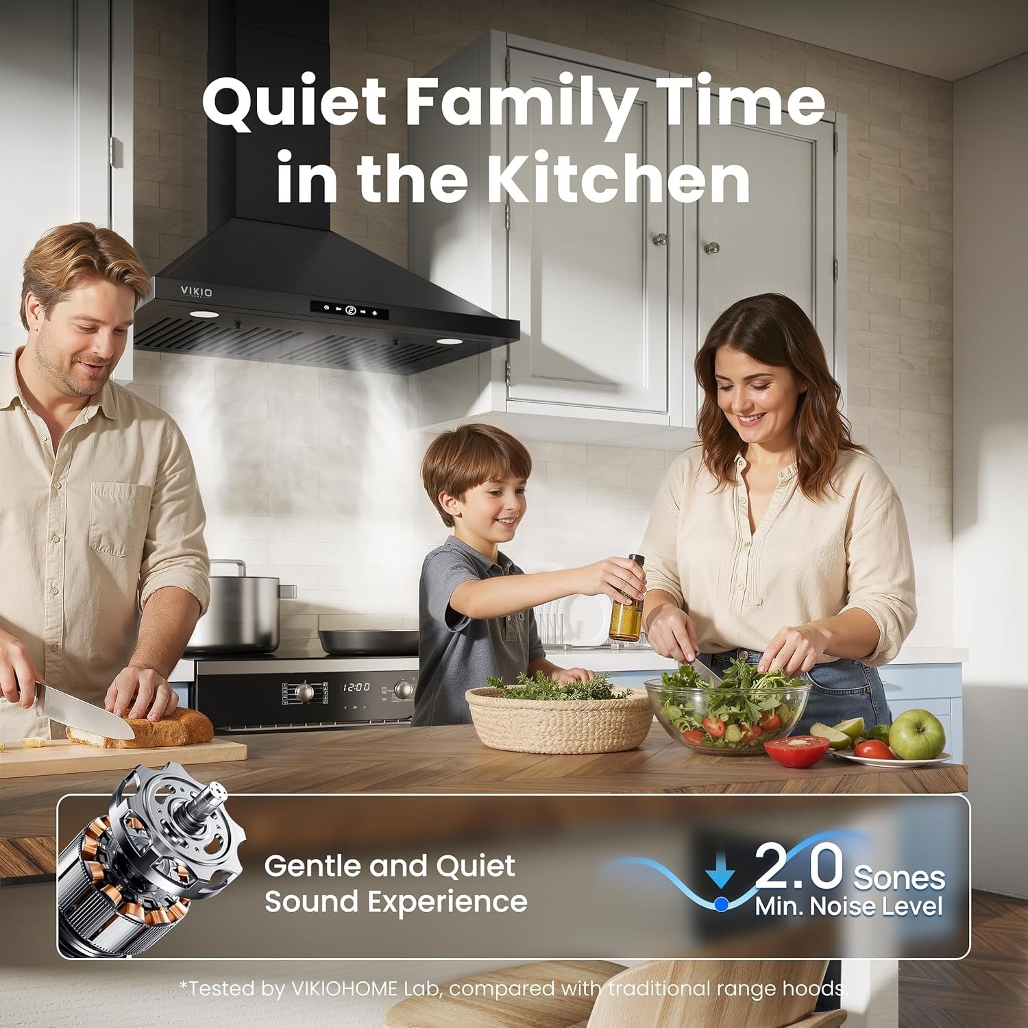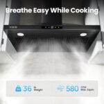- 【Quiet and Powerful Ventilation】The wall mount range hood 36-inch delivers a peaceful cooking environment with noise levels as low as 40 dBA at low speeds and under 65 dBA at high speeds. Its advanced ductwork system minimizes noise while maintaining effective ventilation, ideal for busy kitchens.