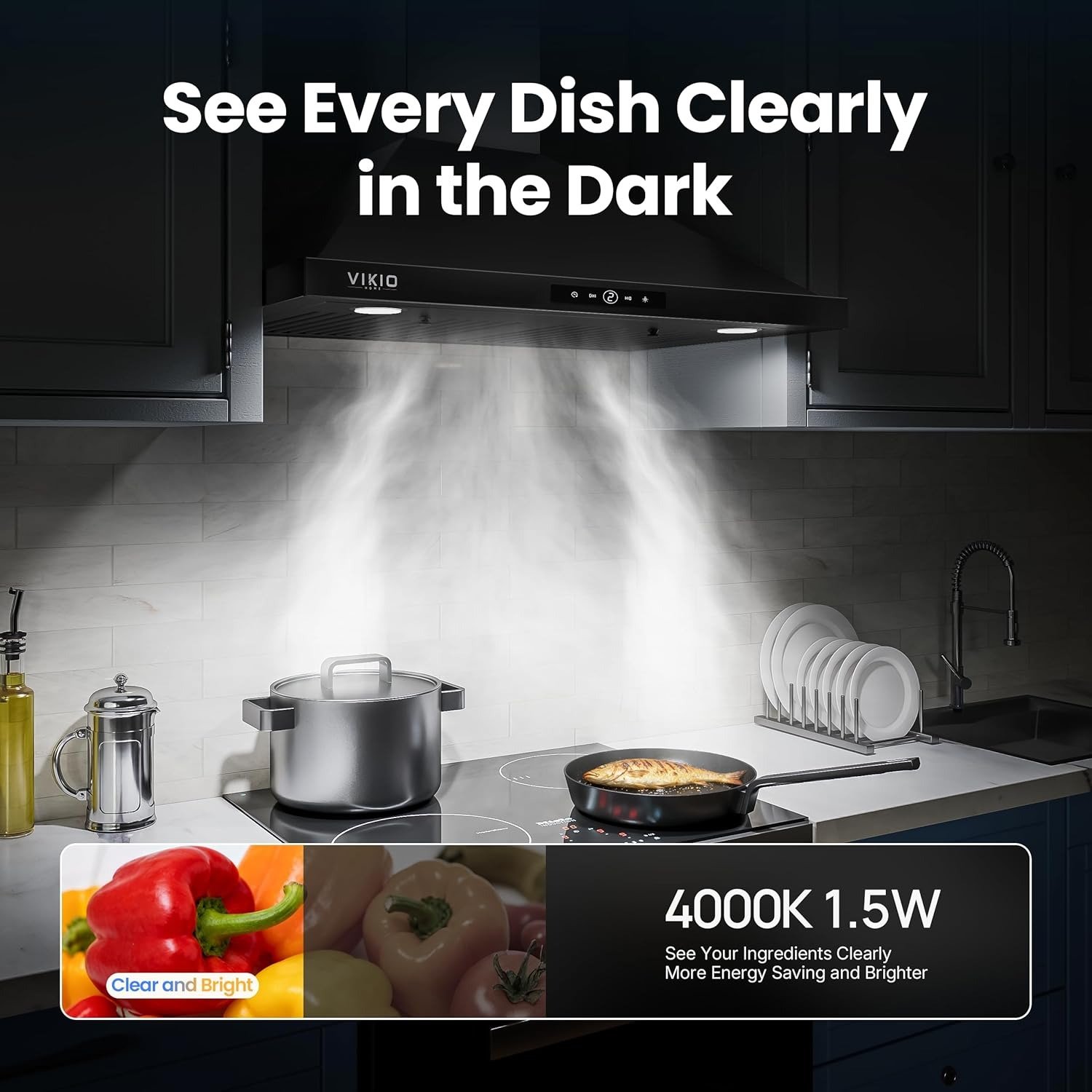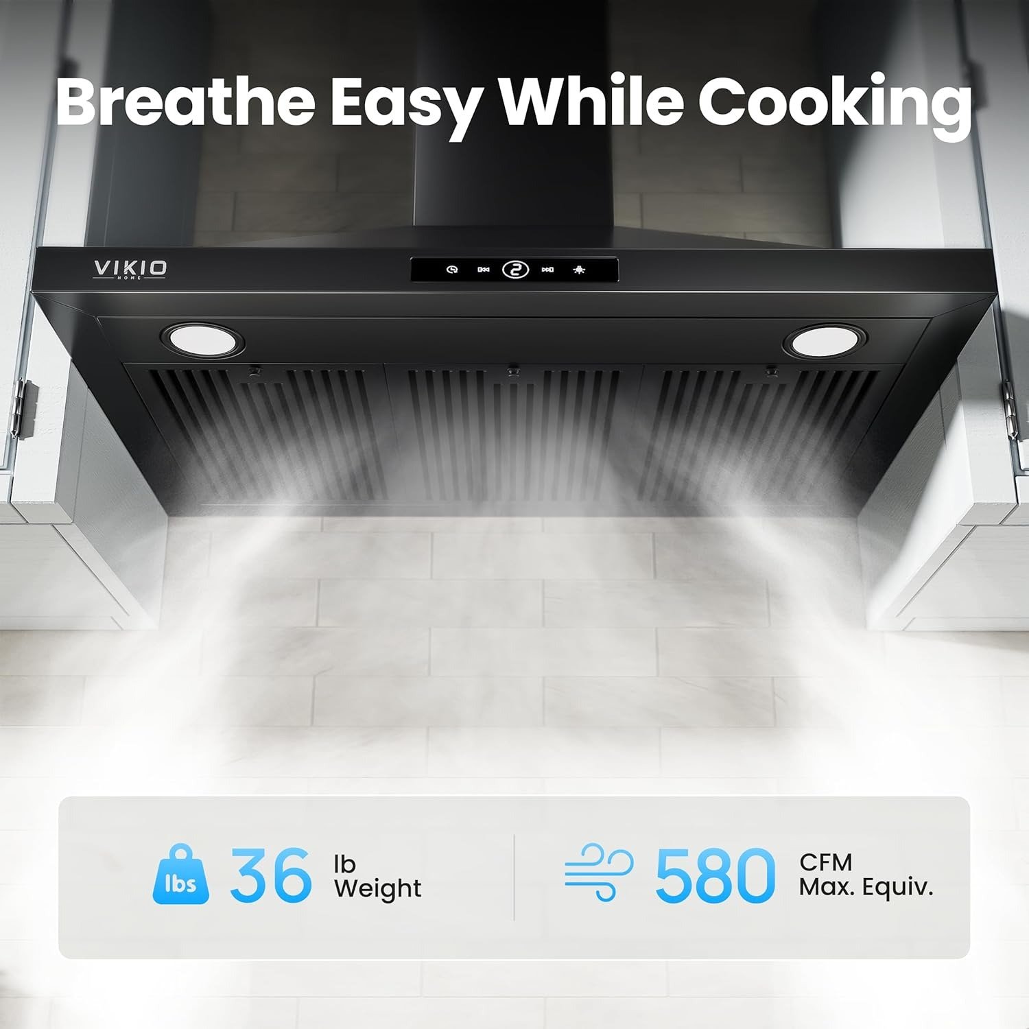 - 【Dual-Intake Motor Design】This motor features dual-sided air intake, increasing airflow by 20% compared to single-sided systems. With a powerful 580 CFM capacity, the wall mount range hood 30-inch effectively eliminates smoke and odors, making it suitable for various cooking styles.