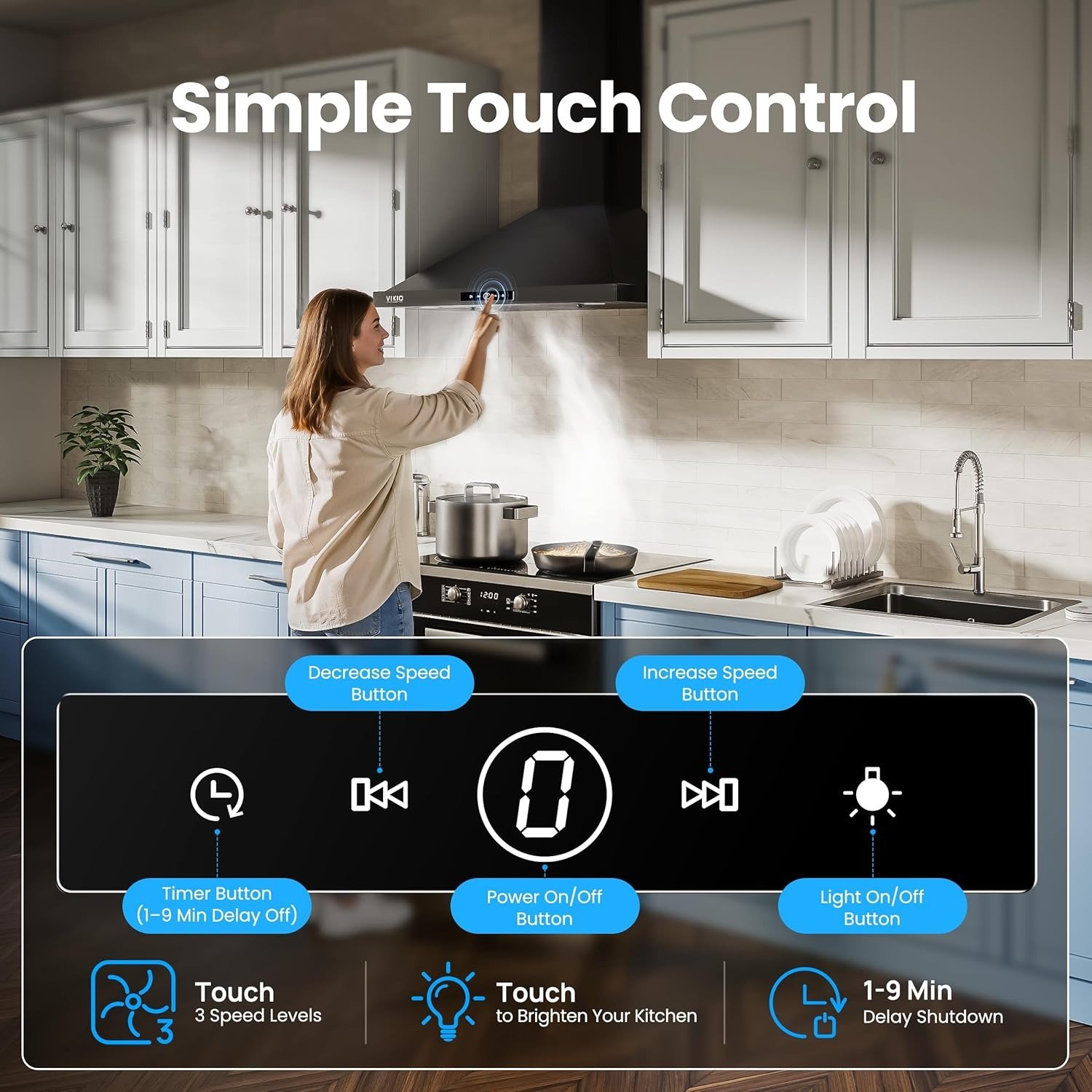 - 【1-9 Min Delay Shut-Off 】The intelligent delay function keeps the hood running for 1 to 9 minutes after you finish cooking. It automatically purges residual steam and stubborn odors (like from fish or hot pot), ensuring your kitchen returns to fresh air. Ideal for maintaining a truly clean and odor-free environment.