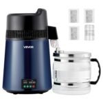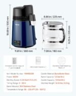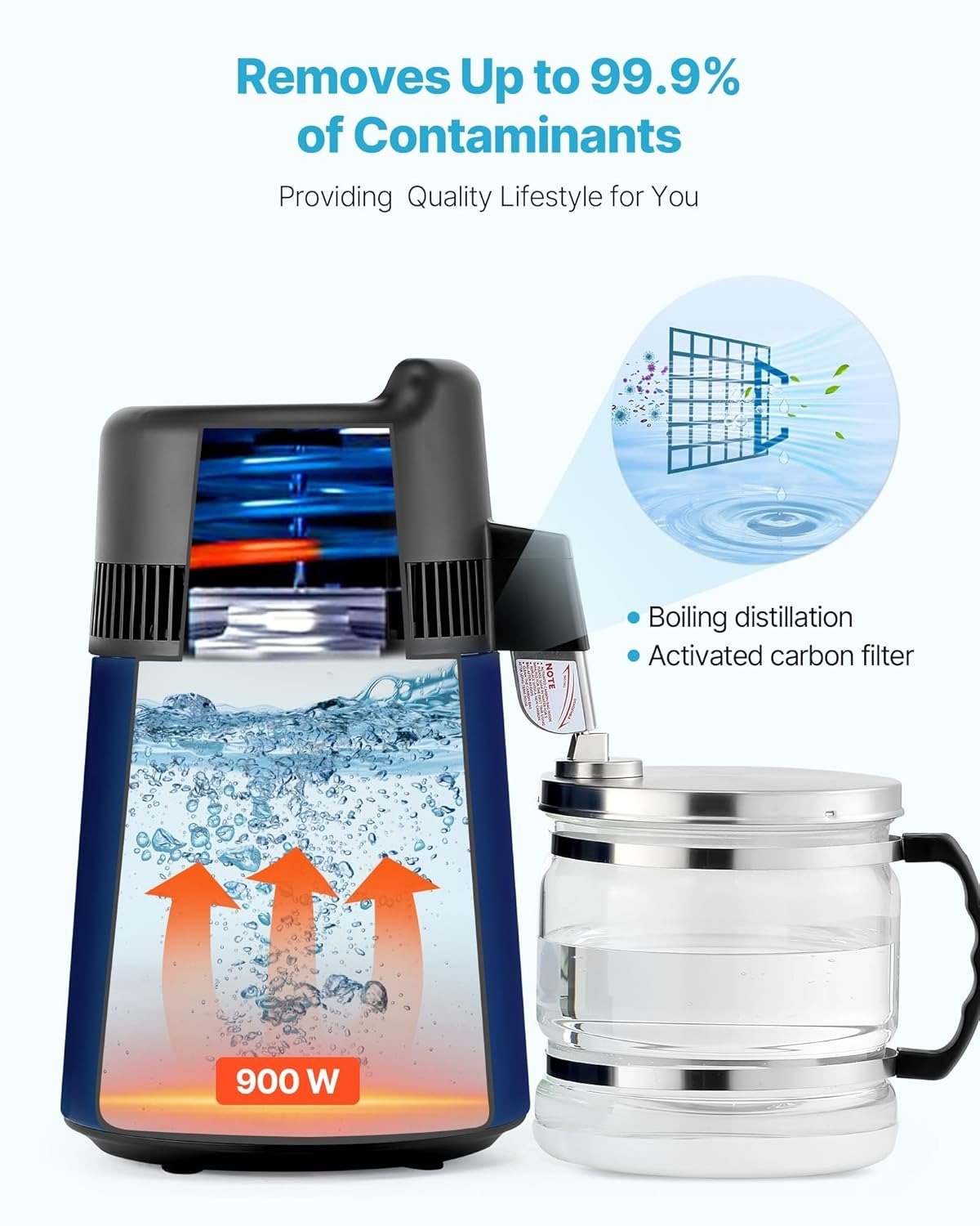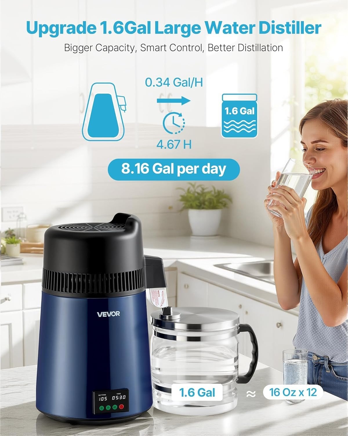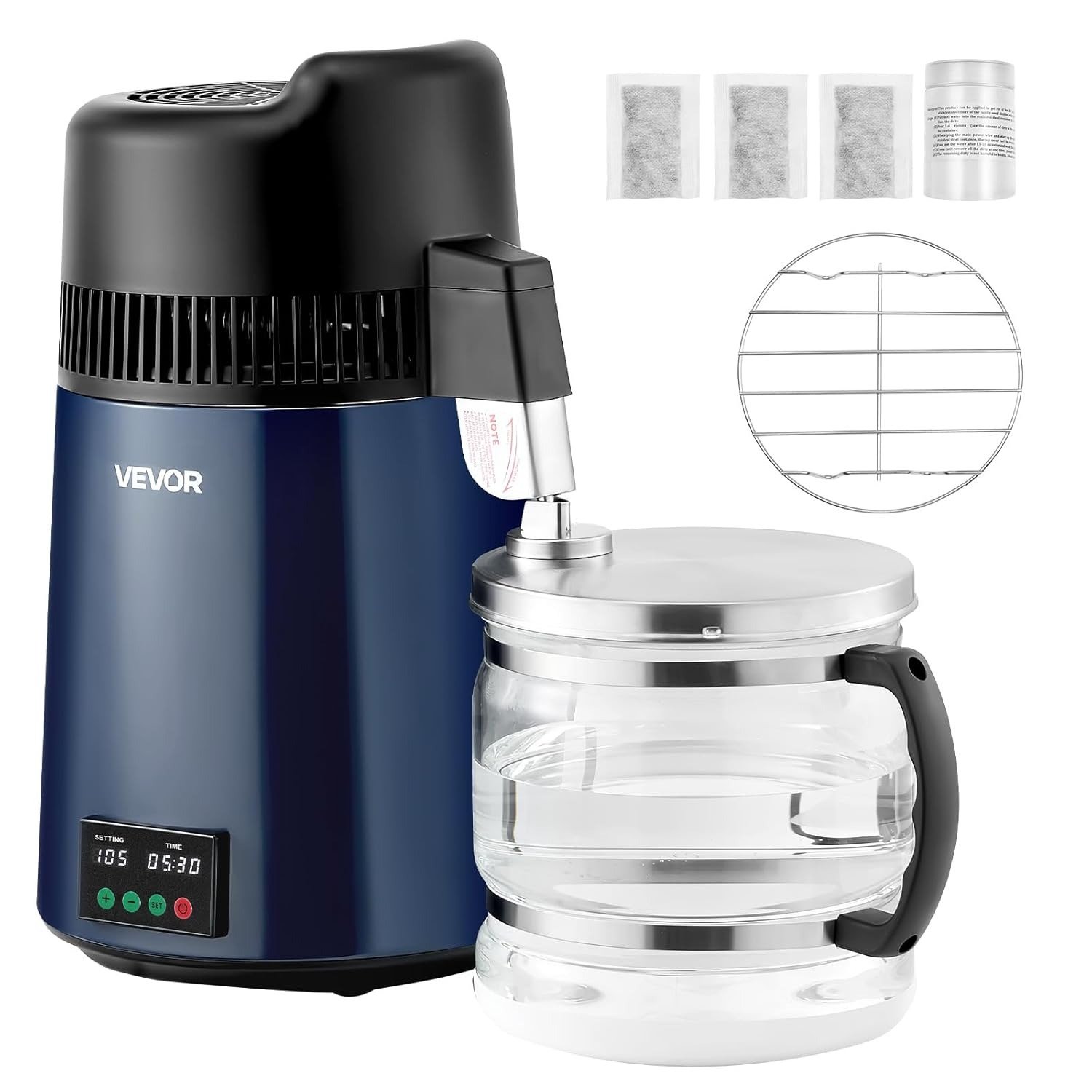 VEVOR Water Distiller, 6L 1.6 Gallon Larger Pure Water Purifier Filter for Home Table Countertop, 900W Glass Pot Distilled Maker, Stainless Steel Body Drinking Machine to Make Clean Waters, Navy