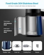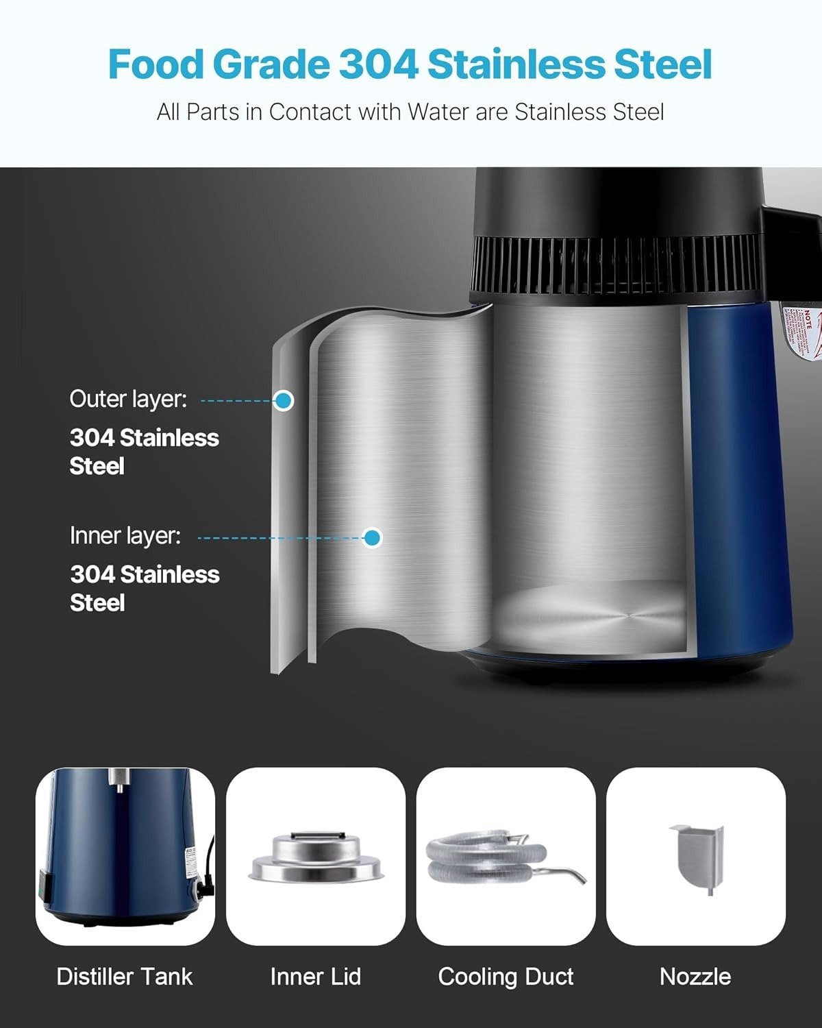 - High-Quality Materials: The distilled water maker features a 304 stainless steel interior water tank. The container is made of high borosilicate glass, with all parts in contact with water being of food-grade materials