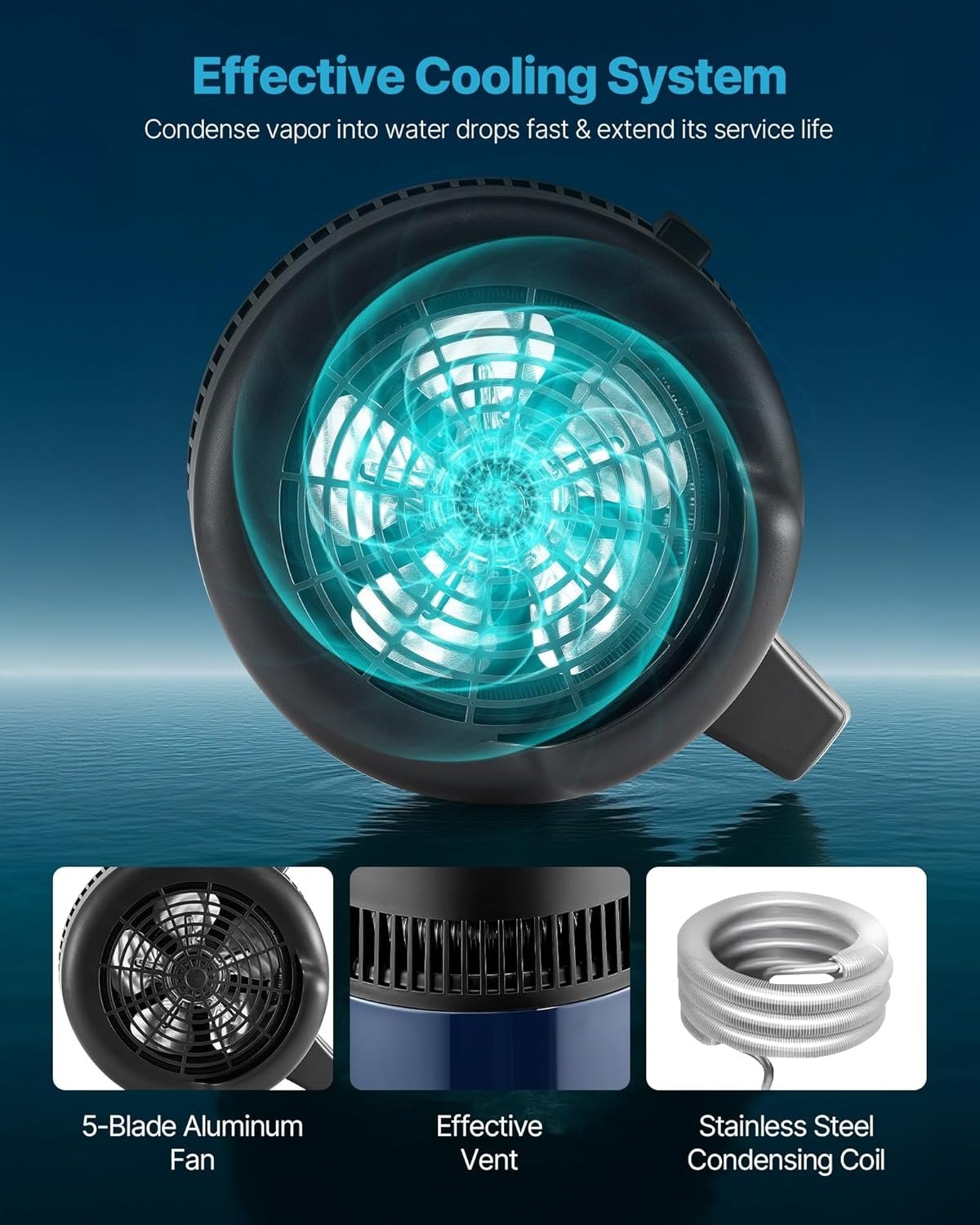 - Effective Cooling: The upgraded distilled water machine’s top four-blade fan is made of aluminum, replacing the fragile plastic, and the exhaust cover has also been upgraded to 304 stainless steel, ensuring heat dissipation and a long service life