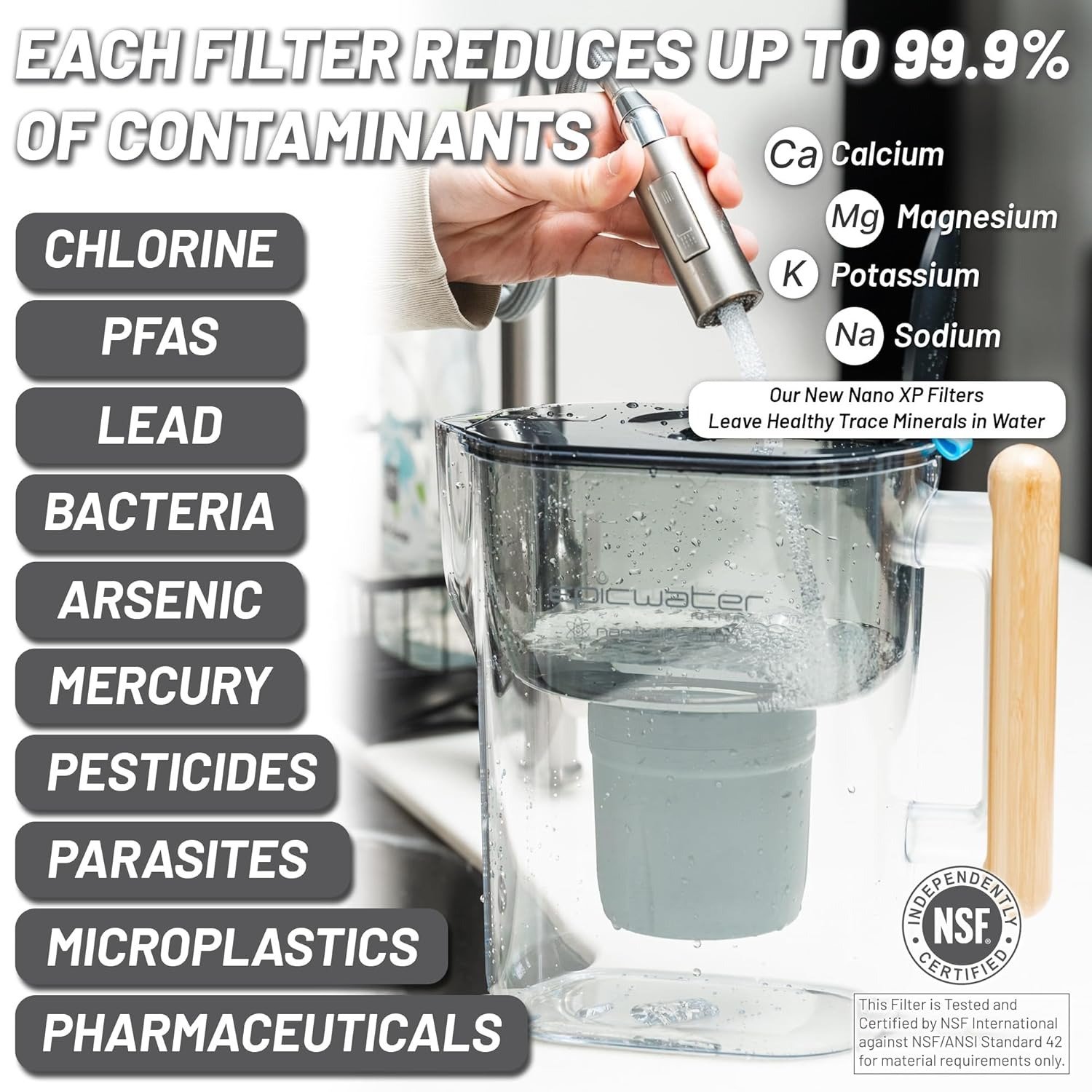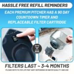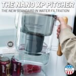 - Filtered Water Pitcher for Refrigerator: This large water filtration pitcher for refrigerator is easy to pour and refill. This space efficient pitcher fits perfectly on refrigerator shelves and is great for families. Height 10″; Width 6″; Length 10″; Weight: 2.2 pounds. This Nanofiber water purifier pitcher with filter will keep your family drinking filtered water for years to come. Rigorously tested against NSF/ANSI standards 42, 53, 401, P231, and P473