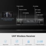 - ENHANCED SIGNAL RELIABILITY: Harnessing the power of Auto Scan, the UHF wireless karaoke microphone system rapidly identifies the least-interference frequency to sync. This advanced feature of the wireless microphone & system increases anti-interference ability and decreases interference between each channel. The wireless DJ microphone system also has lock function to lock selected frequency. 2×100 Selectable UHF frequencies allows multiset operation of up to 16 transmitters simultaneously