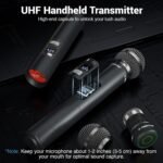 - BOX CONTENTS: 1 x dual channel wireless metal receiver for long operation, 2 x UHF handheld microphone wireless,1 x 1/4’’ audio cable, 1 x 6.5 mm to 3.5 mm adapter, 1 x power adapter, 2 x antenna, 2 x anti-rolling ring, 4 x AA battery for 16 hrs long hour use, 1 x user manual, 4 x rubber feet. You can conveniently source all necessary components from our store, enabling the quick and efficient setup of your system according to your specific needs